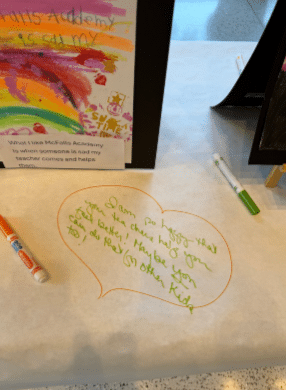 Art was gathered as adults in children’s lives laid down their dreams at the feet of the group in varied forms. When the artwork was exhibited in spaces such as the Muhammad Ali Center, paper taped to tables invited the community to respond. Side by Side Studios was able to enter juvenile (in)justice facilities, where art created by older children was later shared with peers at high schools across the city. Across all of these settings, the paper-covered tables revealed deep knowing and a longing to connect.